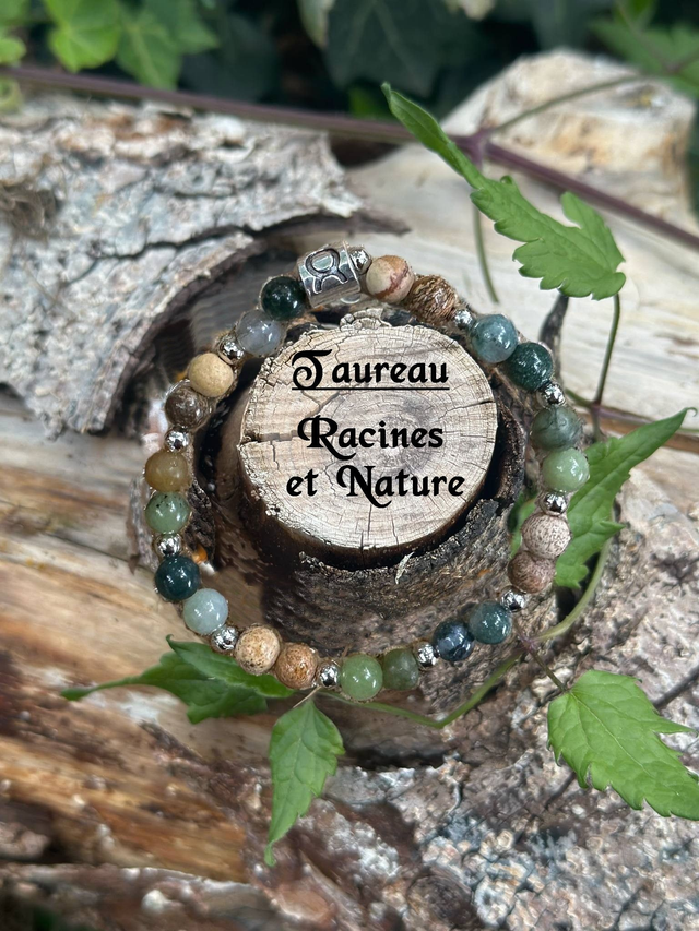 « Ce bracelet, gardien des forces de la Terre, associe l’Agate Mousse, le Jaspe Paysage et le Jade Néphrite. Ensemble, ils offrent au Taureau la stabilité, l’abondance et la sérénité de la nature, l’aidant à s’ancrer dans ses racines tout en cultivant prospérité et bien-être. »