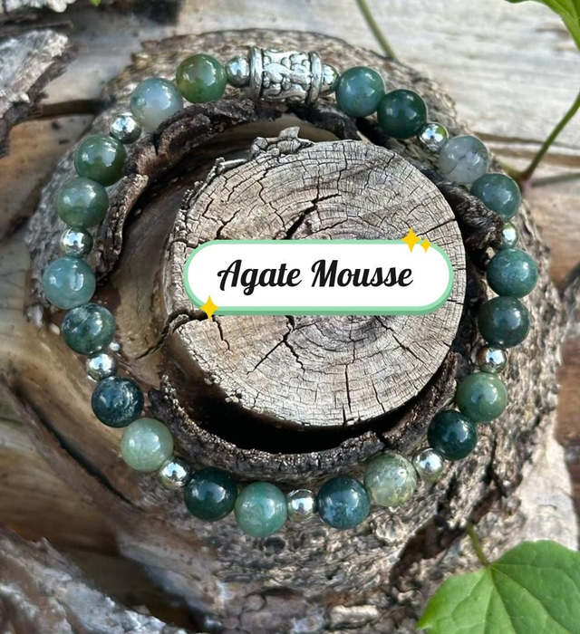 Composé de perles d’agate mousse et orné de breloques argentées, ce bijou porte en lui la sérénité des sous-bois et la force des racines anciennes.