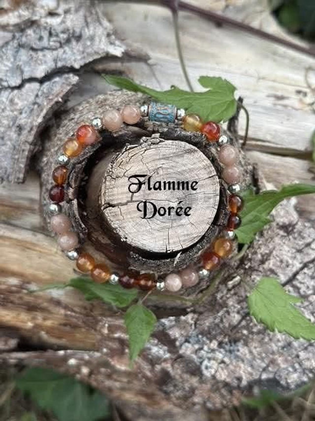 🌟« Étincelant comme un brasier sacré, “Flamme Dorée” marie la lumière bienfaisante de l’Ambre, la radiance énergisante de la Pierre de Soleil et l’ardeur vivifiante de la Cornaline. Ce bracelet insuffle force, optimisme et inspiration, embrasant l’âme d’une énergie chaleureuse et rayonnante. »