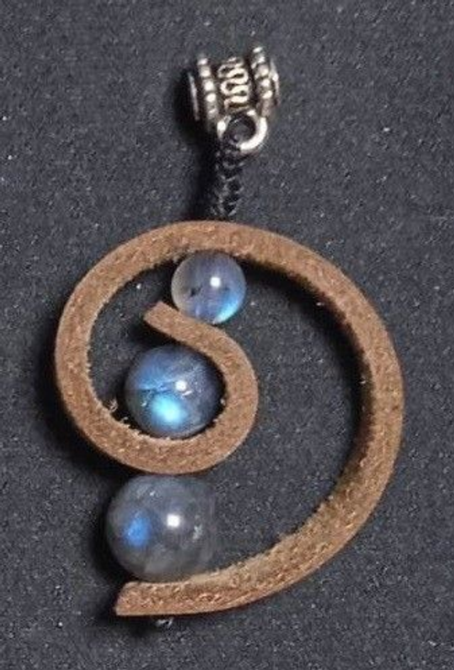 Pendentif artisanal en cuir de boeuf et son trio de perles en labradorite. Labradorite: migraines, stress, confiance en soi