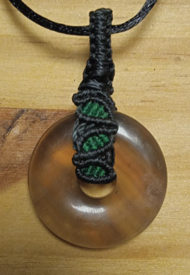 Pendentif donut en fluorite avec bélière en macramé. Fluorite : anorexie, concentration, motivation...