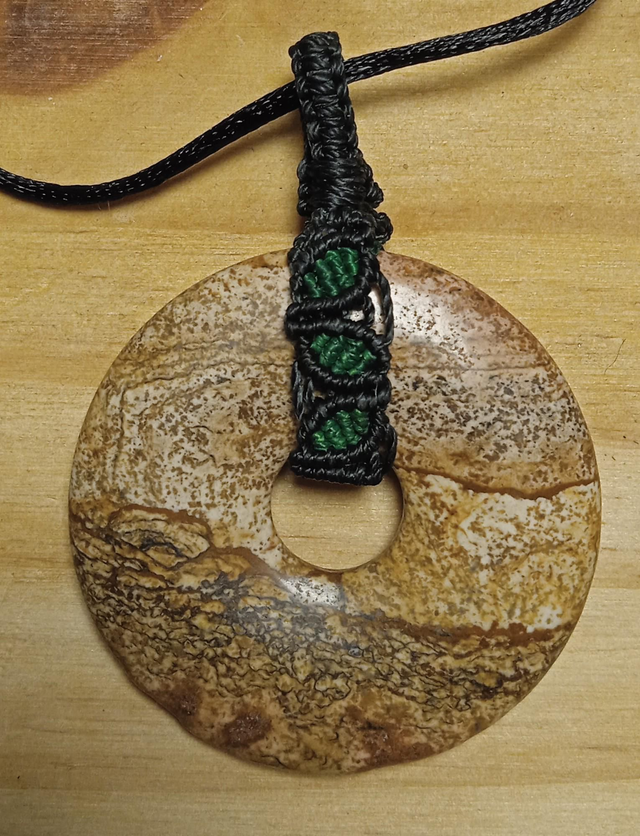 Pendentif donut en jaspe paysage avec bélière en macramé. Jaspe paysage : stress, inspiration, acceptation...