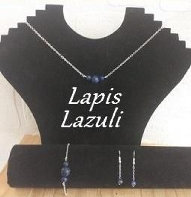 Cette parure en acier inoxydable et perles de lapis lazuli est composée d'un collier réglable en longueur, d'un bracelet en taille réglable et d'une paire de boucles d'oreilles assorties.